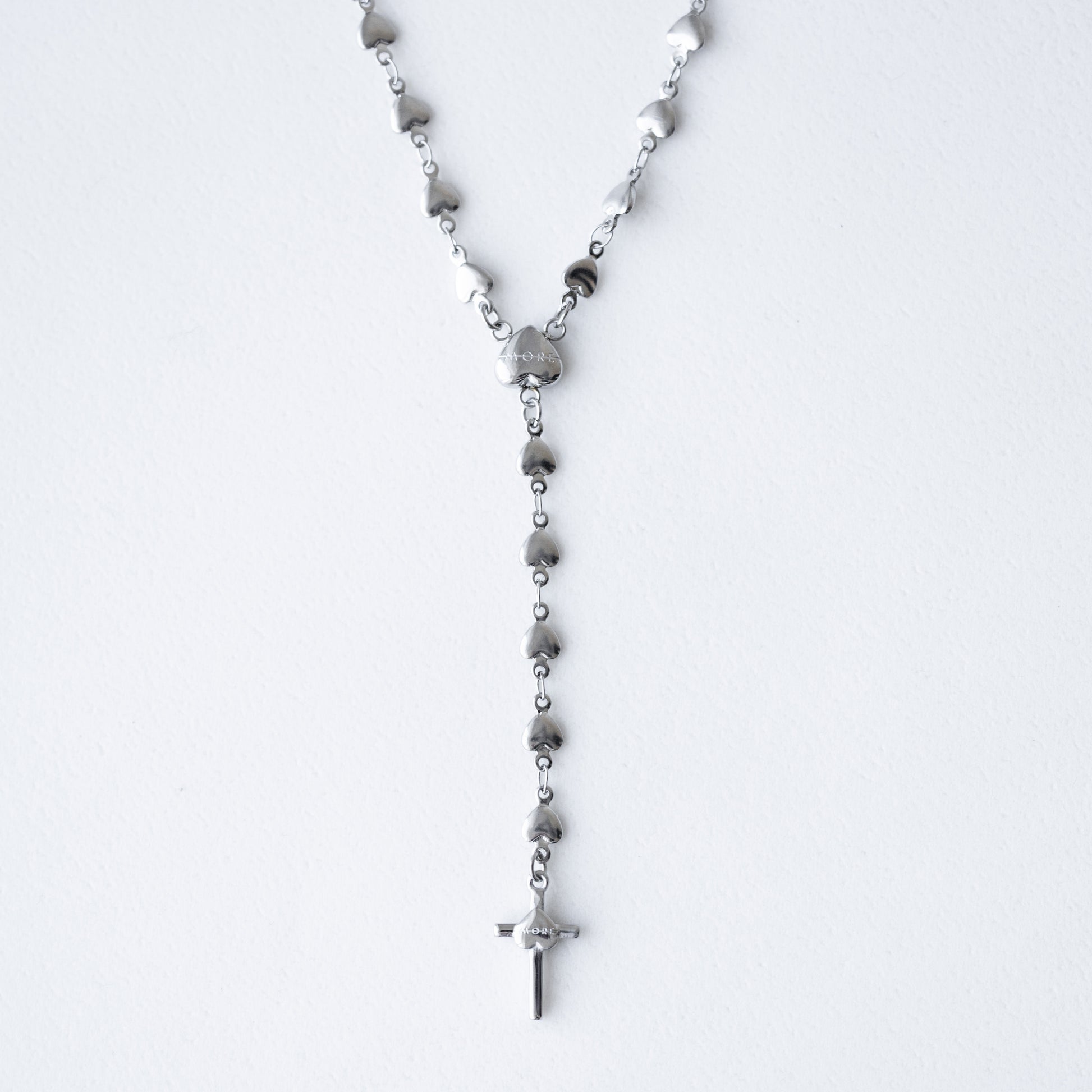 La linea prosegue fino a una piccola croce finale e ad un cuore su cui è inciso con l’iconico logo A-MORE.